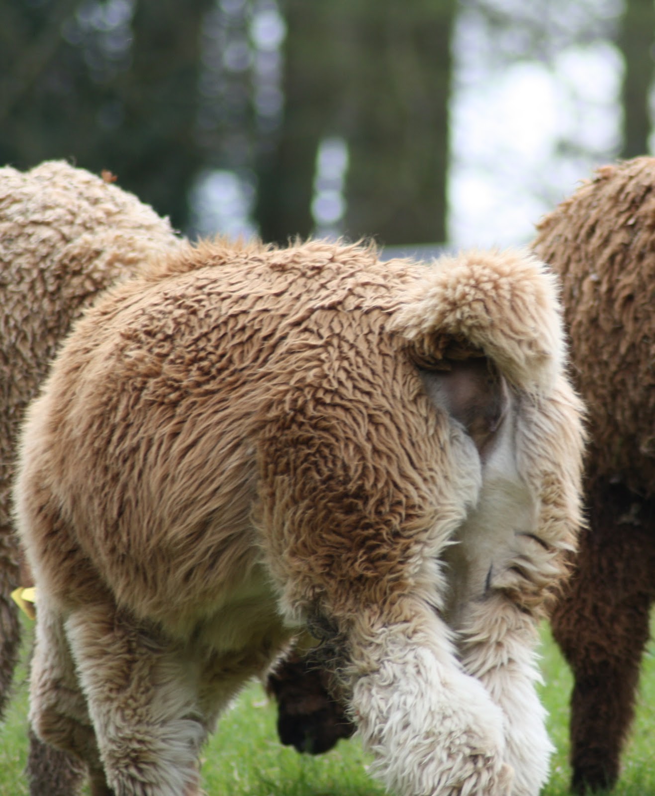 At about a quarter to three we saw Dee running up the hill with a sense of urgency into the top part of the paddock where she disappeared behind a large holly bush. The rest of the herd followed at a more sedate pace and a few minutes later, wellies and waterproofs in place off I trundled up the hill to see what was going on. On my way I noticed that it had stopped raining for the first time of the day and that the wind had dropped. In fact the sun was almost visible through the clouds. As I rounded the corner at the top of the hill I could see Dee lying on her side facing away from me. Something was up. Then I saw something momentarily flick up behind her, something small. It was close to her but too far away from her to be her tail, was it an ear? My pace quickened and as I arrived I could see that it was indeed an ear which was attached to a cria that was just arriving into the world. Considering the weather so far it was a momentarily calm and dry world. A quick check revealed it was a strong healthy looking female who was up in a cush in less than two minutes.